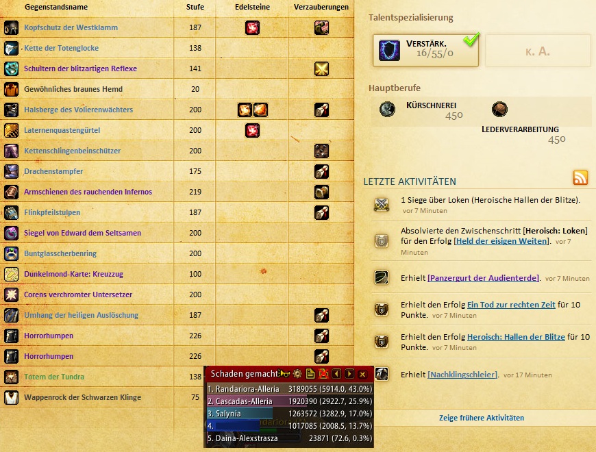 Taschenfranz hat geschrieben:Najo, also vor paar Tagen meinen Schamanen endlich von 79 auf 80 gespielt, paar billige BoE angelegt (item level im Schnitt 183), nochmal durchgelesen welche Knöpfe ich drücken muss und... tadaa...