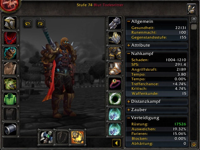 So ist er halt 74 und hat dafür "BiS" Ausrüstung an 8) 22k Leben ungebufft, mehr hatte Rache glaub ich auch nicht als er Anfang WotLK das erste Mal nach Naxx reinmarschiert ist. Allerdings braucht man heutzutage keine Verteidigungswertung mehr, da ist ne Menge item budget frei für Ausdauer.