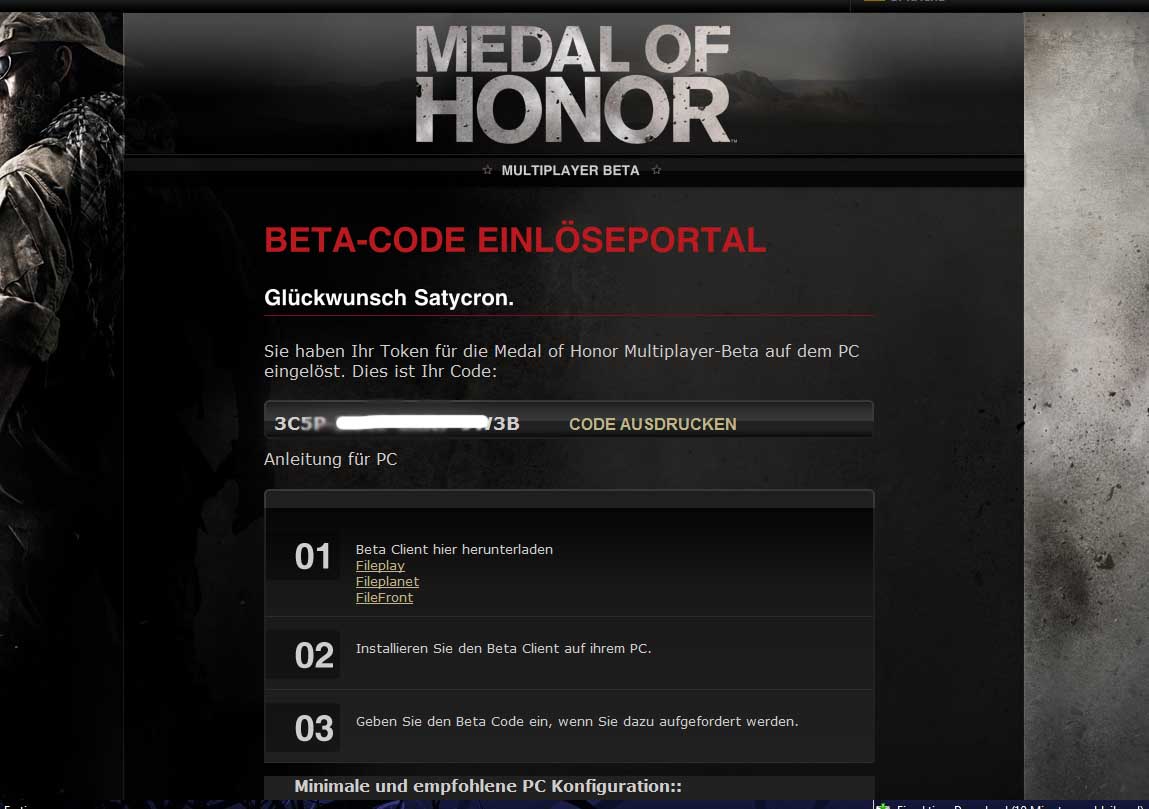 ich hätte noch einen Medal of Honor Beta Key abzugeben, wer interesse hat kann sich gerne bei mir melden.